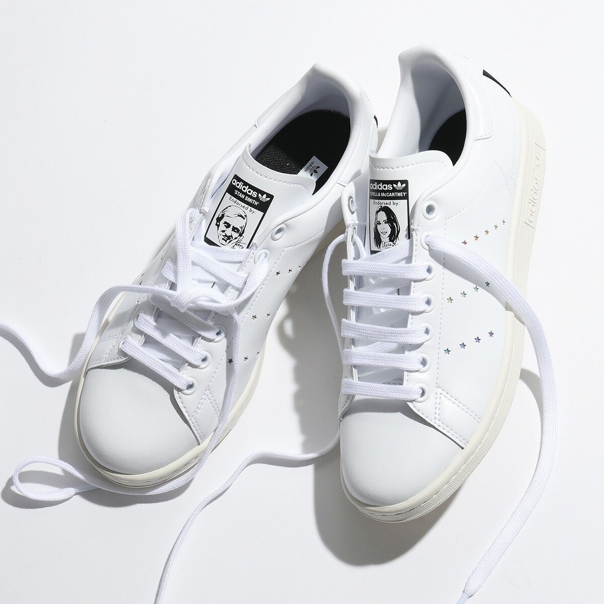 右足のタン部分にはオリジナル同様にスタン・スミスの顔を、左足にはステラのポートレートとサインが施され、アディダスのスリーストライプスの代わりにステラ・スターが刻まれ、さらにかかと部分にはバイカラーのストライプバンド、ブランドロゴがあしらわれたスペシャルなレインボーデザインに仕上がっております。