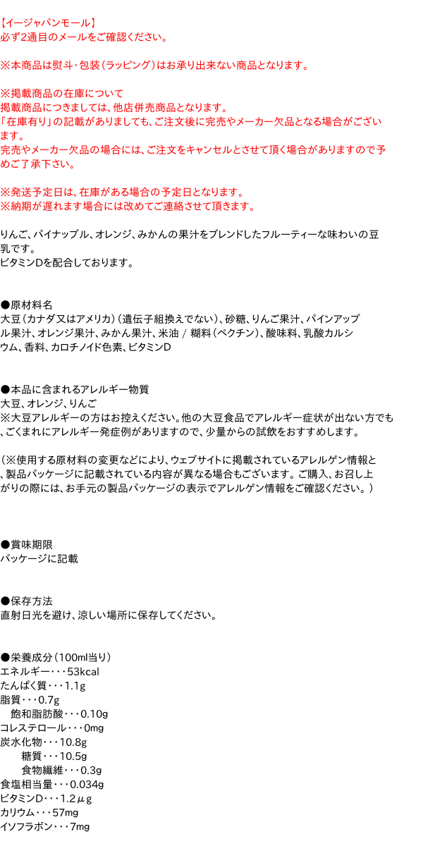 ●原材料名 大豆(カナダ産)(遺伝子組換えでない)、砂糖、りんご果汁、パインアップル果汁、オレンジ果汁、みかん果汁、米油、糊料(ペクチン)、香料、酸味料、乳酸カルシウム、カロチノイド色素、ビタミンD ●本品に含まれるアレルギー物質 大豆、オレンジ、りんご ※大豆アレルギーの方はお控えください。